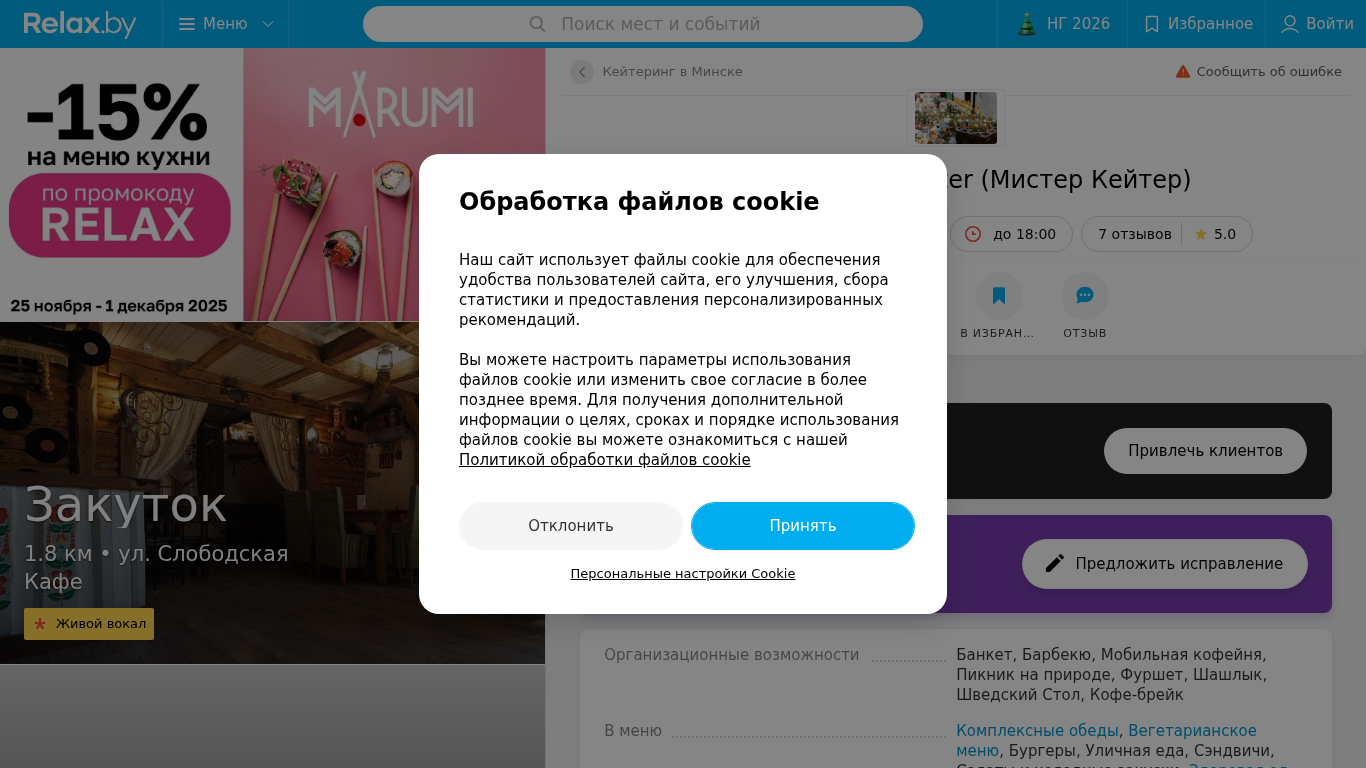 | SEO-описание | Кейтеринг Mr. Cater (Мистер Кейтер) в Минске – отзывы, телефоны, график работы и карта проезда на Relax.by |