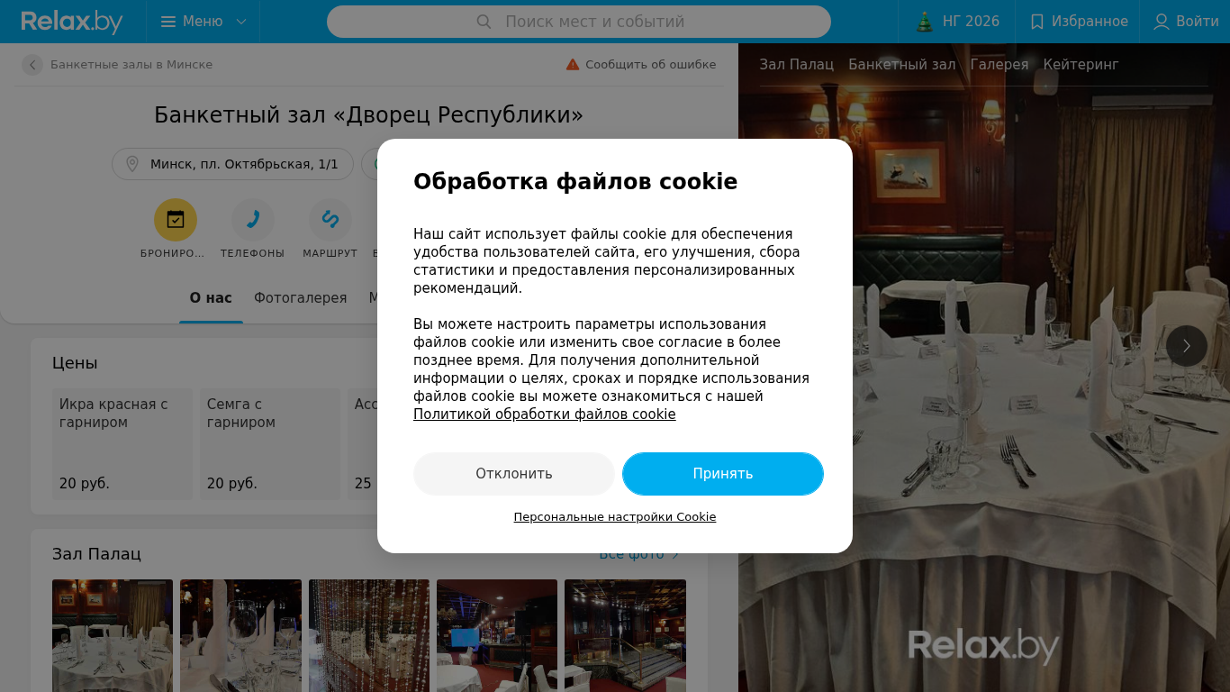 | SEO-описание | Банкетный зал Дворец Республики в Минске – отзывы, адрес на карте, телефоны, график работы и карта проезда на Relax.by |