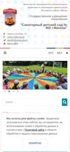 | AI-анализ | This online resource is the official website of the State Educational Institution "Sanatornyy Detskiy Sad No. 402 g.Minsk" under the Ministry of Education of the Republic of Belarus. The website provides information about the sanatorium-school for children located in Minsk, Belarus. The main sections of the site include the administrative structure, administrative procedures, educational offerings, contacts and schedules. Keywords associated with the site include words related to the group, the year 2025, policy, prophylaxis, work, children, detailed information, Belarus, help, Belarusian institutions, state, safety, regime, activities, MChS, nutrition, musical and physical education, social and psychological services, important documents, and the portal for rating evaluation. The site also features a section on the institution's anti-corruption policy and |