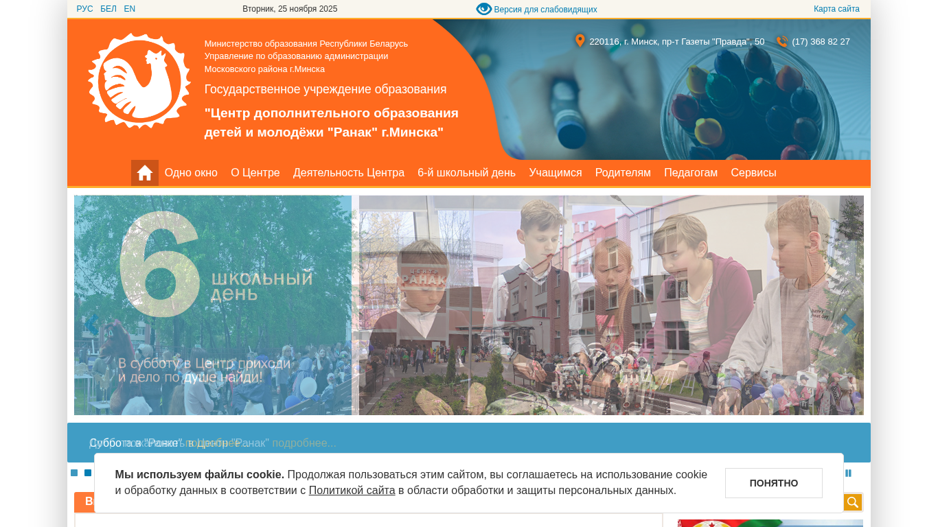 | AI-анализ | The web project "Ранак.мінск.эдю.бы" (Ranak.minsk.edu.by) is the official website of the Center for Additional Education for Children and Youth Ranak located in Minsk, Belarus. The website provides information about the center's activities, including news, educational programs, and contact details. Visitors can find information about the center's schedule, administrative procedures, and popular requests. The site is managed by the Ministry of Education of the Republic of Belarus and the Administration of the Moscow District of Minsk. The website uses cookies and has a accessibility version for visually impaired individuals. The content is available in Russian, Belarusian, and English. The center offers various activities, such as online registration, health and wellness programs, and artistic spaces. The site also includes a virtual museum of military history and a section |