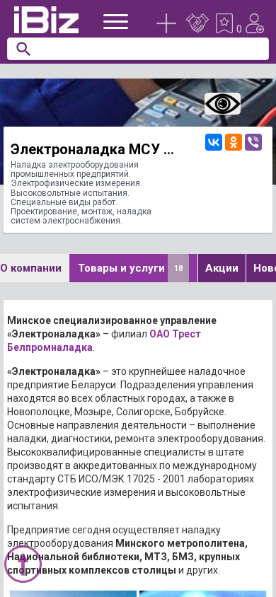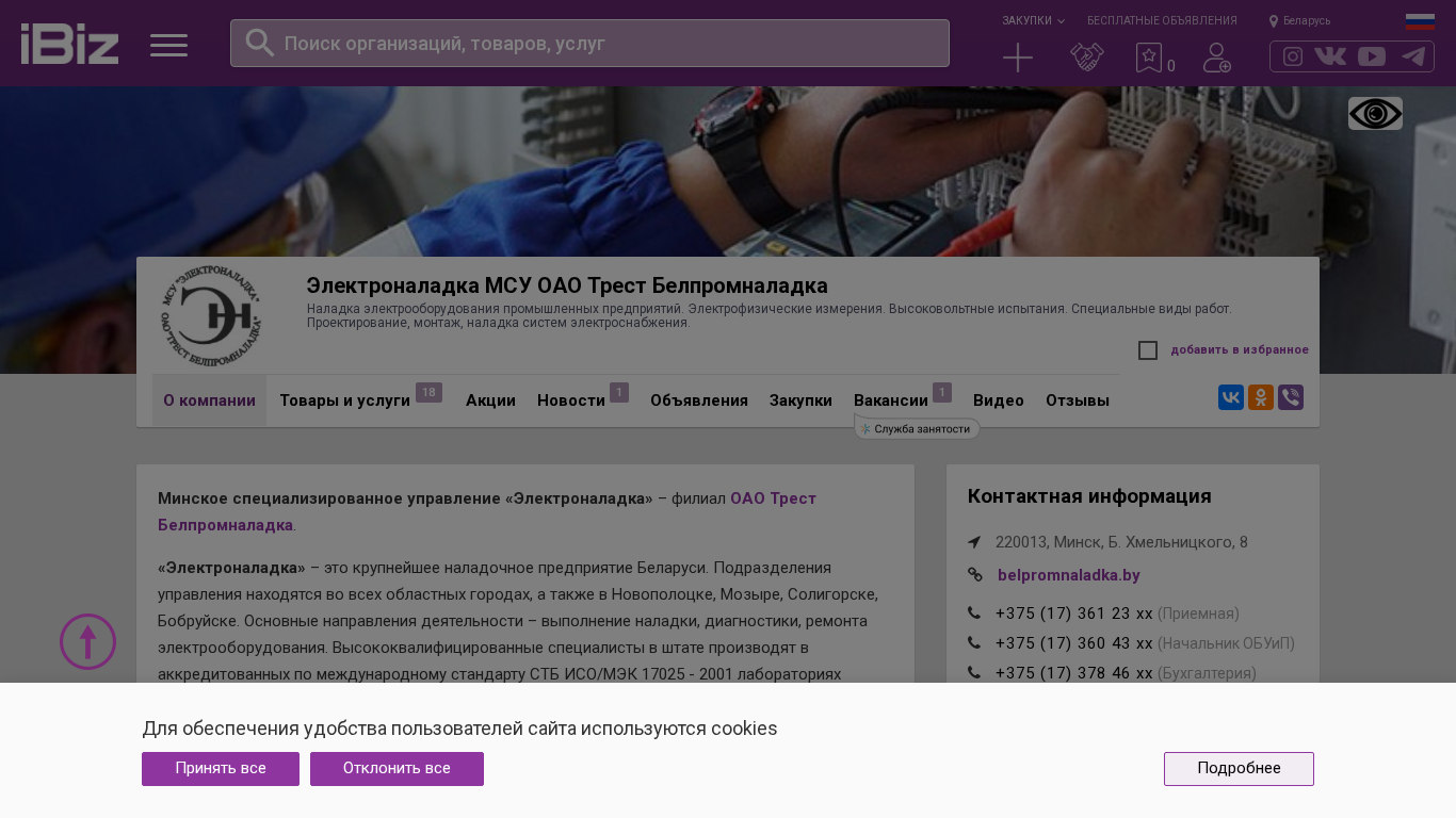 | Название / Заголовок | Электроналадка МСУ ОАО Трест Белпромналадка - Наладка электрооборудования промышленных предприятий. Электрофизические измерения. Высоковольтные испытания. Специальные виды работ. Проектирование, монтаж, наладка систем электроснабжения.. 220013, Минск, , Б. Хмельницкого, 8 |