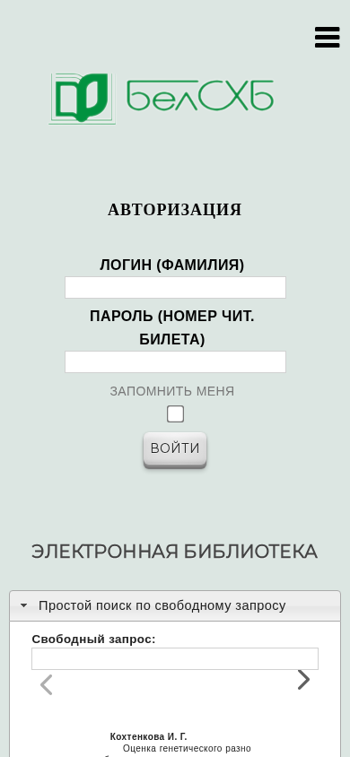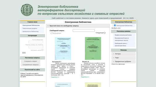 | AI-анализ | The web project "Электронная библиотека" (electronic library) is a Belarusian educational website primarily focused on academic research, with a strong emphasis on scientific fields and specialties. Keywords indicate the presence of various research materials, such as text, dissertations, and autoreferats. Users can search for information related to academic degrees, candidata studies, and scientific fields, including сельскохозяйственных (agricultural) and технических (technical) disciplines. The site features a user registration system, allowing users to log in with their last name and password, or a library card number. The site is in a testing phase and users are encouraged to provide feedback. The site has a large number of links to mail.ru for various functionalities, including a script for keeping the page alive and a Google Analytics tracking code. The site's design is based |