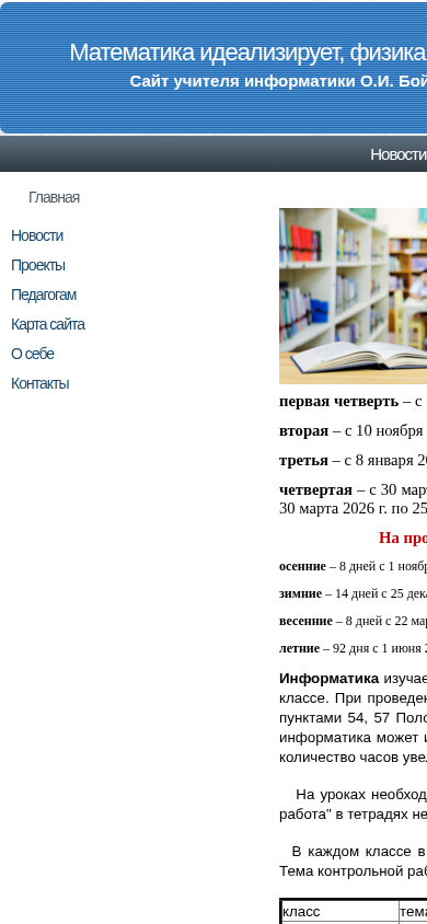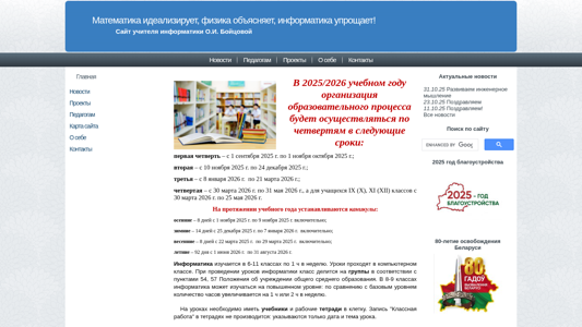 | AI-анализ | This website is dedicated to education, specifically in the areas of mathematics, physics, and informatics. The title translates to "Mathematics idealizes, physics explains, informatics simplifies!" The description contains phrases like "open the section," "news," "2025," and "contact us," suggesting that there may be various resources, updates, and a way to get in touch with the site's maintainers. Keywords associated with the site include "opening," "sections," "2025," "news," "pedagogas," "projects," "selves," "students," "class," "informatics," "developing," "engineering thought," and "site map." The site uses a progress bar animation and has a wide border. The domain is informatika-school9.lepshy.by. |