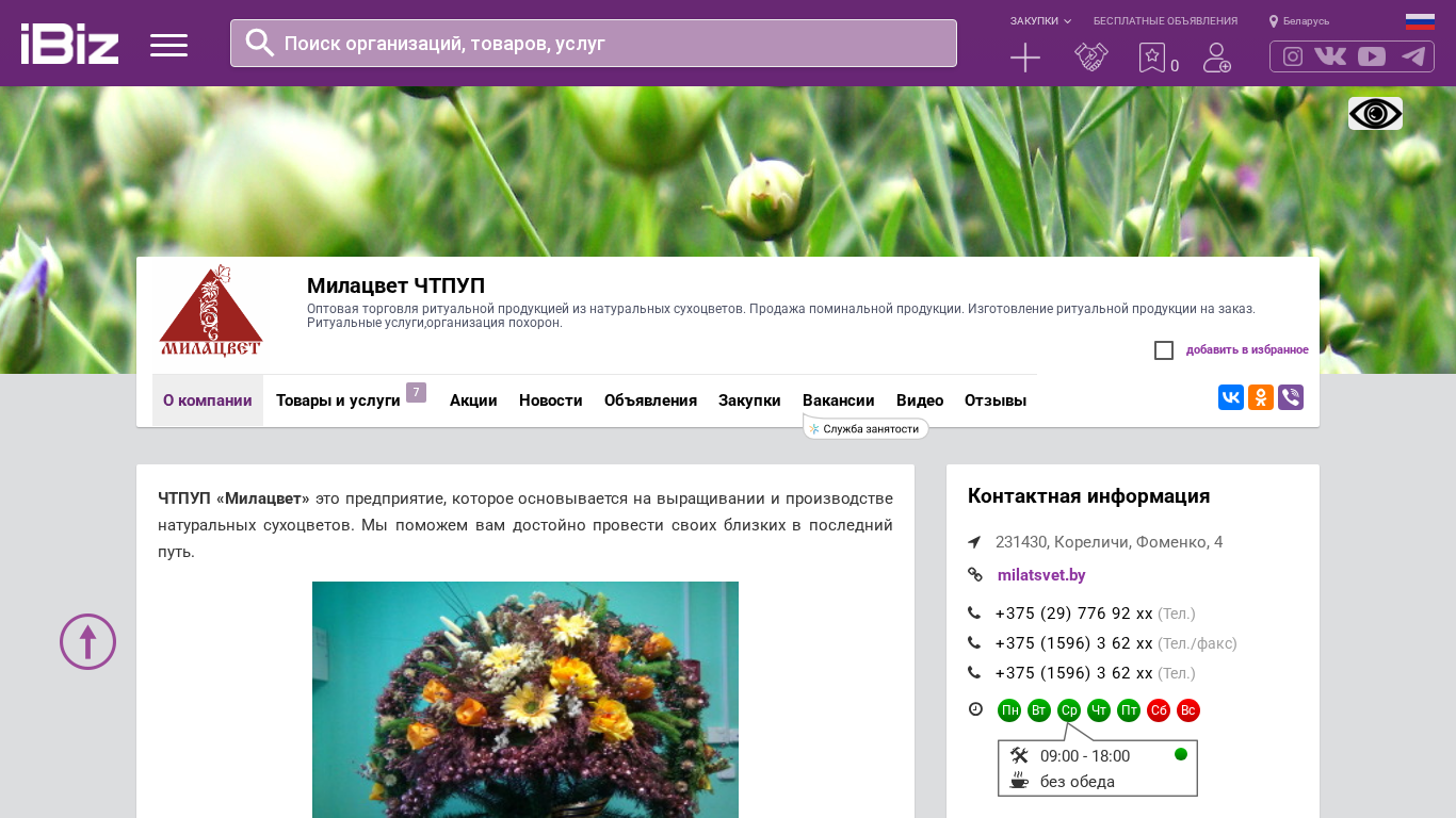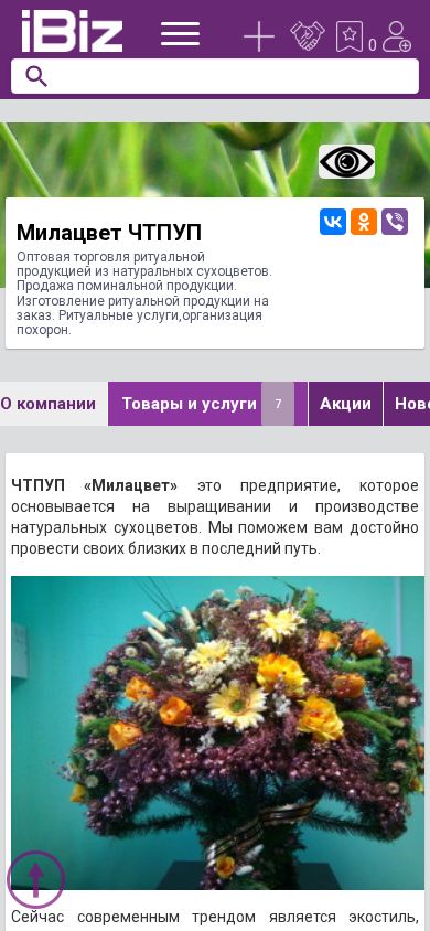 | AI-анализ | The portal Milatsvet CHTUP is an optoelectronic trade platform for ritual products made of natural dried flowers. It offers the sale of funeral products and custom-made ritual products. The company also provides ritual services and organizes funerals. The address of the company is 231430, Korelichi, Minsk region, Fomenko, 4. |