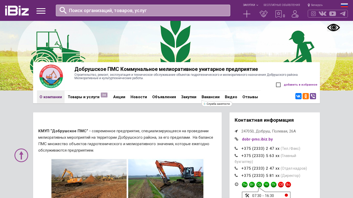 | AI-анализ | --- The portal dobr-pms.ibiz.by is dedicated to Dobruskoe PMS, a communal meliorative unity enterprise in Belarus specializing in construction, repair, exploitation, and technical maintenance of hydro-technical and meliorative objects in the Dobrusch region. The site offers meliorative and culturally technical works. The address of the company is 247050, Dobrush, Polevaya, 26A. The title of the webpage includes the name of the enterprise, the types of services provided, and the region it serves. The keywords associated with the site include 'works', 'services', 'meliorative', 'repair', 'construction', 'objects', 'systems', and 'Dobrusch'. The site appears to focus on agricultural and infrastructure melioration projects, offering services for the repair and maintenance |