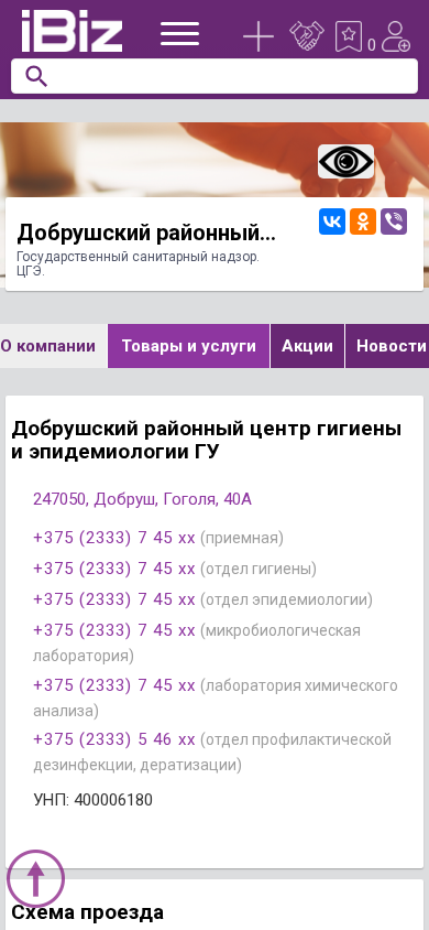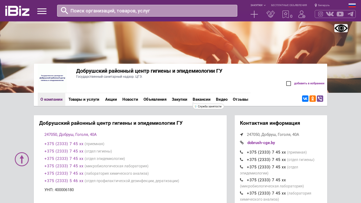 | Название / Заголовок | Добрушский районный центр гигиены и эпидемиологии ГУ - Государственный санитарный надзор. ЦГЭ.. 247050, Добруш, , Гоголя, 40А |