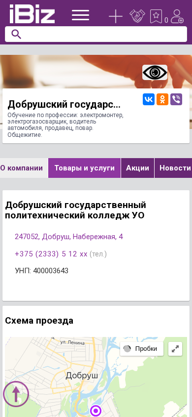 | Название / Заголовок | Добрушский государственный политехнический колледж УО - Обучение по профессии: электромонтер, электрогазосварщик, водитель автомобиля, продавец, повар. Общежитие.. 247052, Добруш, , Набережная, 4 |