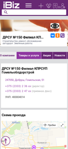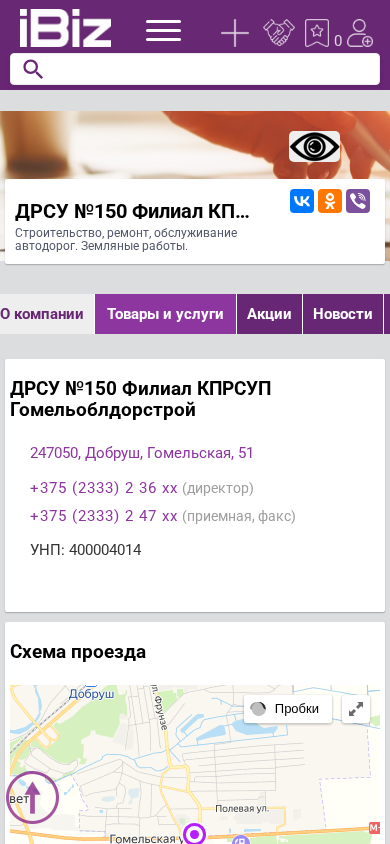 | Название / Заголовок | ДРСУ №150 Филиал КПРСУП Гомельоблдорстрой - Строительство, ремонт, обслуживание автодорог. Земляные работы.. 247050, Добруш, , Гомельская, 51 |