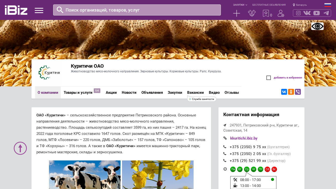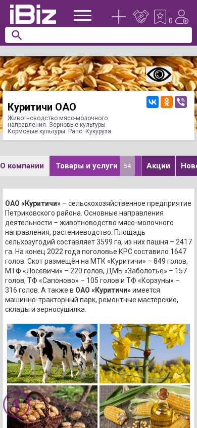 | Название / Заголовок | Куритичи ОАО - Животноводство мясо-молочного направления. Зерновые культуры. Кормовые культуры. Рапс. Кукуруза.. 247931, , Куритичи аг., Советская, 14 |