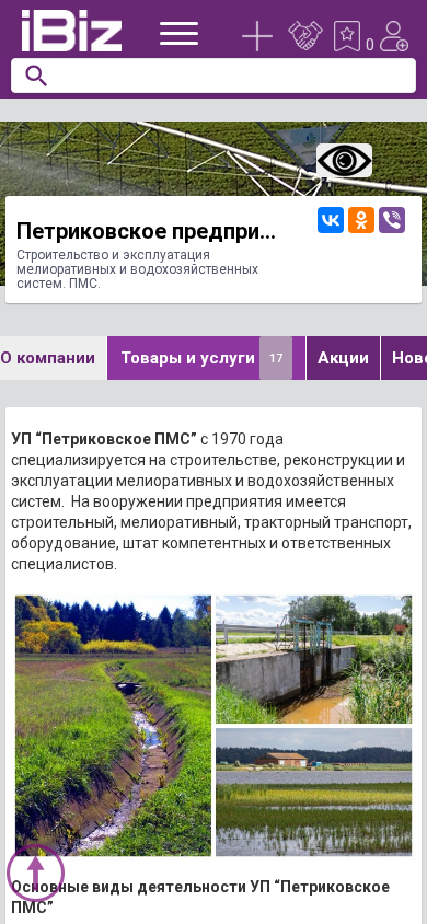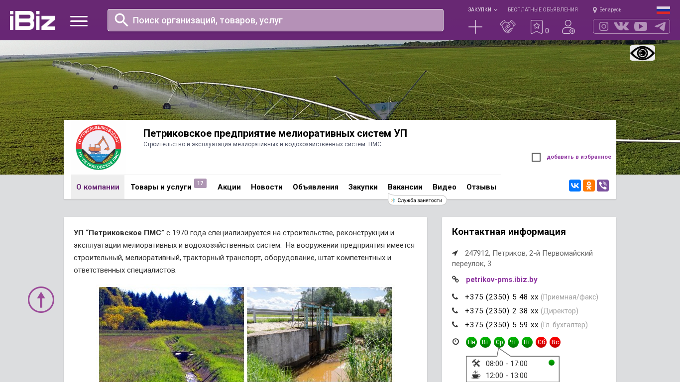 | Название / Заголовок | Петриковское предприятие мелиоративных систем УП - Строительство и эксплуатация мелиоративных и водохозяйственных систем. ПМС.. 247912, Петриков, , 2-й Первомайский переулок, 3 |