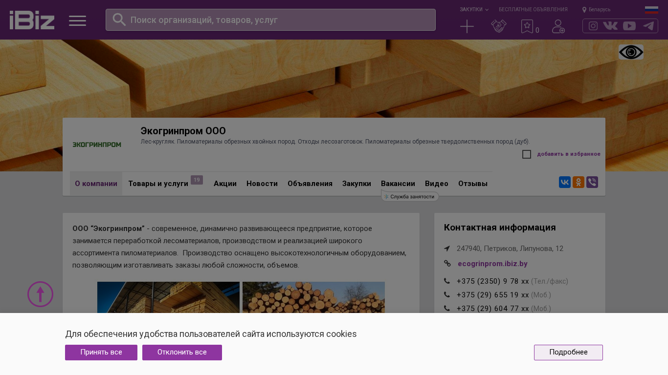 | Название / Заголовок | Экогринпром ООО - Лес-кругляк. Пиломатериалы обрезных хвойных пород. Отходы лесозаготовок. Пиломатериалы обрезные твердолиственных пород (дуб).. 247940, Петриков, , Липунова, 12 |