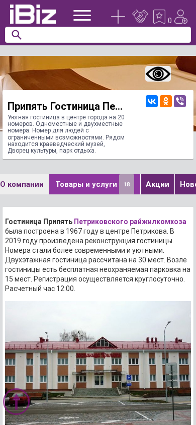 | AI-анализ | This website is for a hotel named Припять Гостиница Петриковский райжилкомхоз located in Petrikov, Belarus. The hotel has 20 rooms, offering both single and double occupancy. There is also a room available for people with limited abilities. Nearby attractions include a local history museum, a cultural palace, and a park. The address is Гагарина, 13, 247912, Petrikov. No parking information or contact details are provided on the website. The hotel was built in 1967 and underwent reconstruction in 2019. It now offers more modern and cozy accommodations, with a total capacity of 30 guests. Each room includes a shower, sink, toilet, television, kettle, and refrigerator. Amenities nearby include a cultural center, museum, and rec |