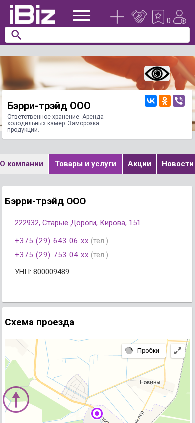 | Название / Заголовок | Бэрри-трэйд ООО - Ответственное хранение. Аренда холодильных камер. Заморозка продукции.. 222932, Старые Дороги, , Кирова, 151 |