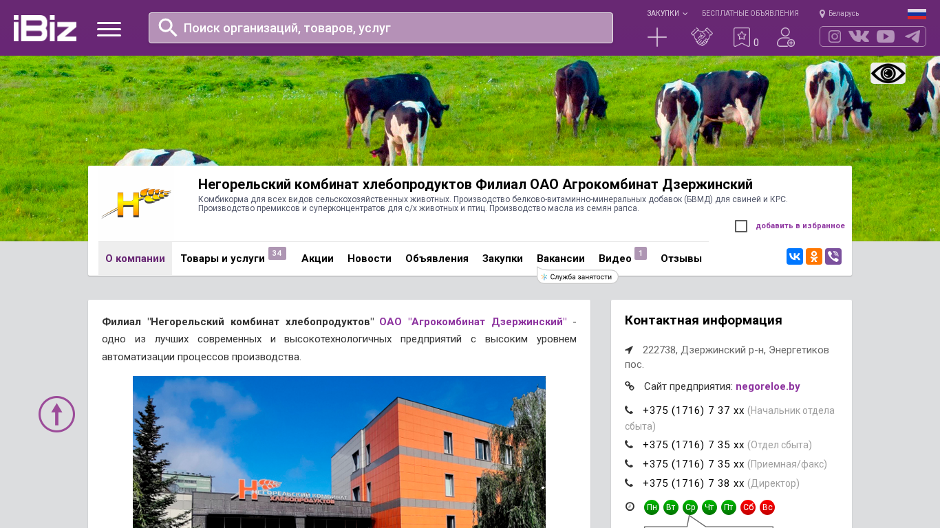 | Название / Заголовок | Негорельский комбинат хлебопродуктов Филиал ОАО Агрокомбинат Дзержинский - Комбикорма для всех видов сельскохозяйственных животных. Производство белково-витаминно-минеральных добавок (БВМД) для свиней и КРС. Производство премиксов и суперконцентратов для с/х животных и птиц. Производство масла из семян рапса.. 222738, , Энергетиков пос. |
