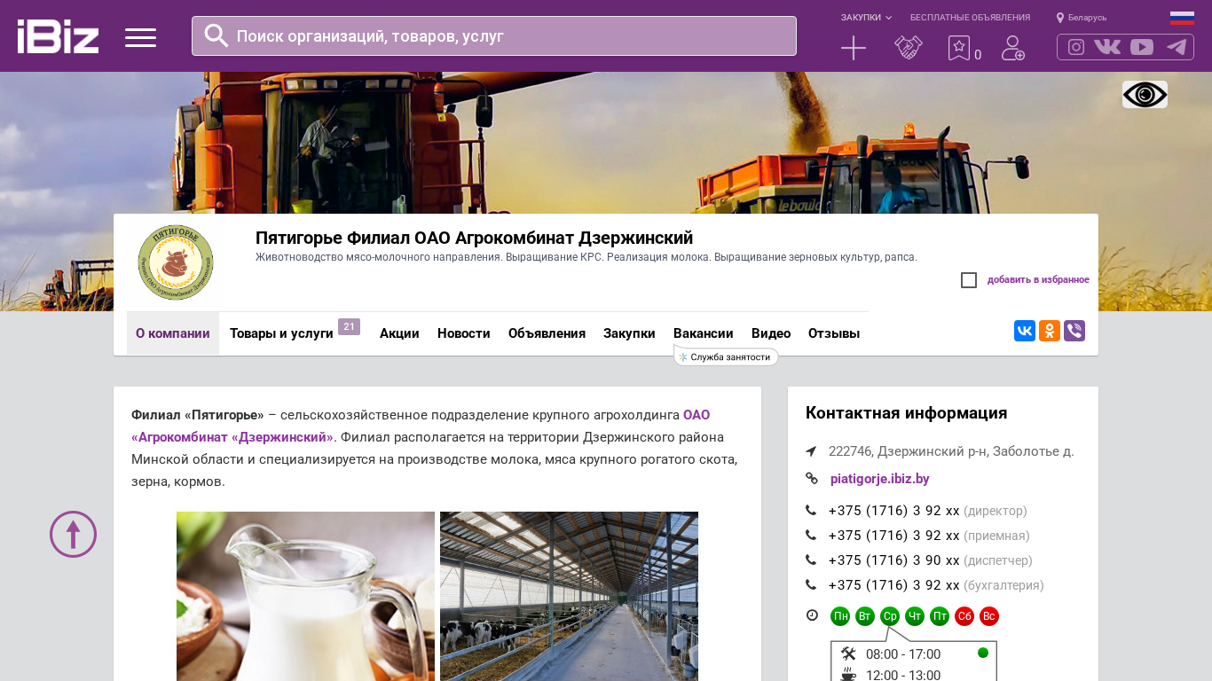 | AI-анализ | This website represents the Piatigorie Branch of OAO Agrokombinat Dzerzhinsky, focusing on livestock farming with a meat and dairy orientation. The farm raises and sells cattle, produces milk, and grows corn, rapeseed, and other grains. The address and contact information for the company, located in the Dzerzhinsky district of the Minsk region, is also provided. |