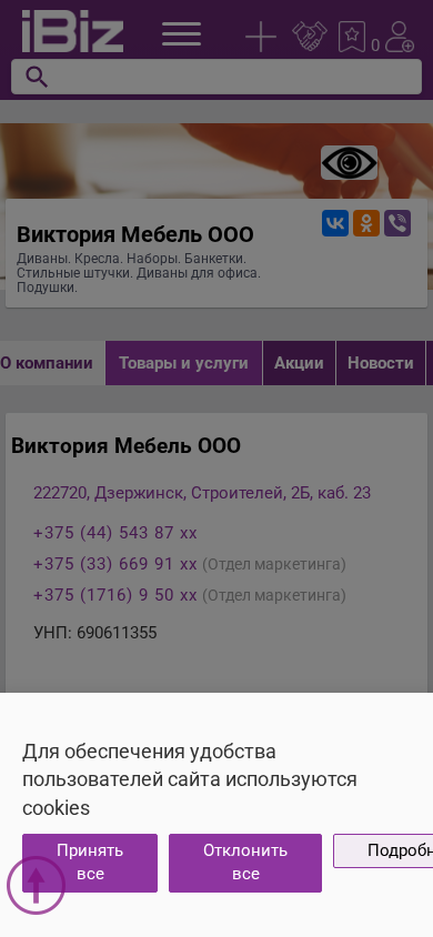 Название / ЗаголовокВиктория Мебель ООО - Диваны. Кресла. Наборы. Банкетки. Стильные штучки. Диваны для офиса. Подушки.. 222720, Дзержинск, , Строителей, 2Б, каб. 23