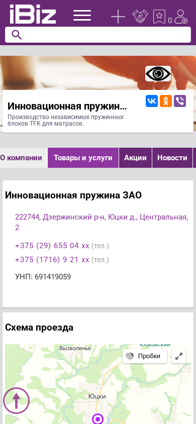 | AI-анализ | The website is for Innovative Spring ZAO, a company based in Belarus that produces independent coil spring blocks TFK for mattresses. The contact information and address are provided, as well as a map for directions. The company offers various mattress components and furniture fittings. The website includes sections for news, vacancies, and customer reviews on social media platforms such as VKontakte and Odnoklassniki, as well as Viber. The contact numbers are +375 (29) 655 04 xx and +375 (1716) 9 21 xx. The business hours are from 9:00 to 18:00, Monday to Friday, with Saturdays and Sundays being holidays. The company can be found in the categories of furniture fittings and components in Dzerzhinsk, Belar |