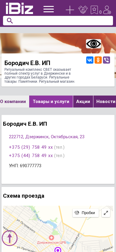 | AI-анализ | The portal is a ritual complex named СВЕТ, operated by Е.В. Бородич IP, offering a full range of services in Dzerzhinsk and other cities in Belarus. The services include ritual goods and monuments, as well as a ritual shop. Contact information, map, and opening hours can be found on the website. |