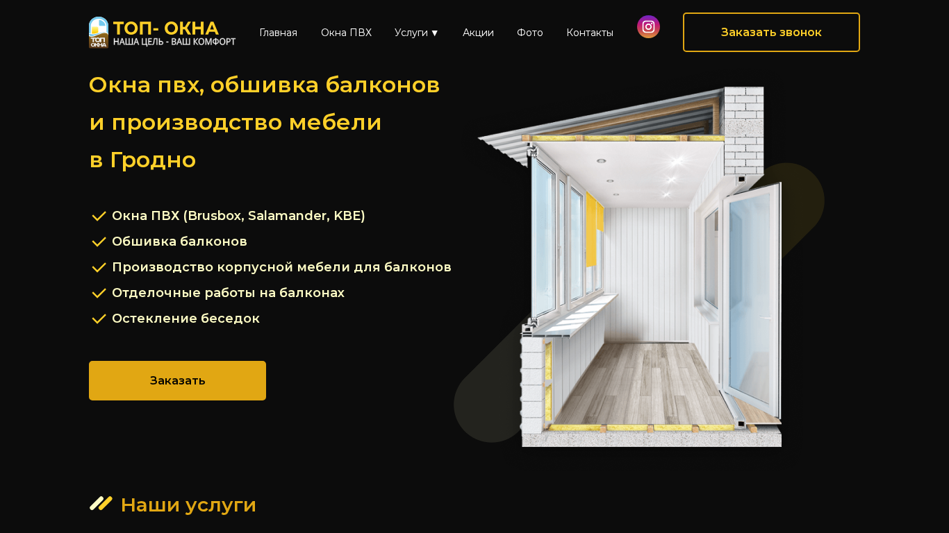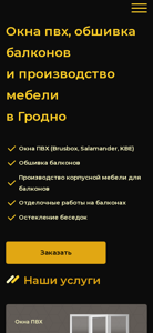 | AI-анализ | --- The portal top-okna.by is dedicated to providing PVC windows and related services in Grodno, Belarus. Keywords include 'windows', 'PVC', 'services', 'balconies', 'glass', 'production', 'molding', 'molding works', 'molding materials', and 'prices'. The website features information about various types of PVC windows, such as Brusbox, Salamander, and KBE, as well as services for balcony covering, production of custom furniture for balconies, and glass works for balconies and terraces. The company offers installation, removal of construction waste, and permanent discounts. They have been in business for over 10 years and guarantee professional installation and various types of guarantees. Clients can contact the company via phone or email for consultations, orders, or inquiries. The website includes a photo gallery and a section |