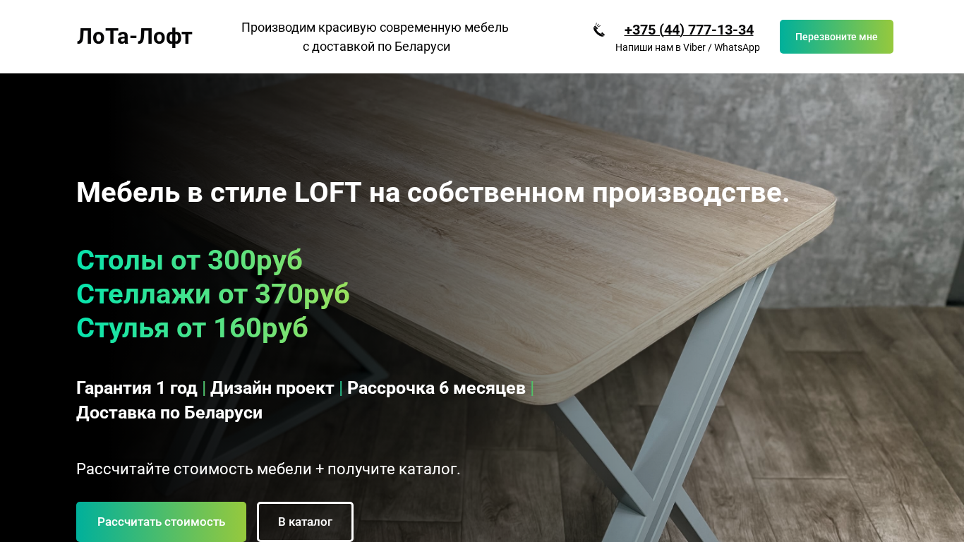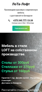 | AI-анализ | --- This website, titled "Lota-loft," specializes in the custom production of modern furniture with metal frames and elements of LDSP, pine, and oak. The company, located in Gomel, Belarus, offers delivery throughout the country. The site provides options for a one-year warranty, design projects, six-month installment plans, and delivery to Belarus. Visitors can calculate the cost of furniture and receive a catalog. The website is managed by Tatiana, who ensures the quality of the company's OOO "Lota-loft" products, including tables, shelves, chairs, office furniture, bar furniture, restaurant furniture, café furniture, entryway furniture, wardrobes, cabinets, shelves, consoles, under-table pieces, and garden furniture. The site offers a variety of wooden and LDSP finishes, with customers able to select the colors with the |