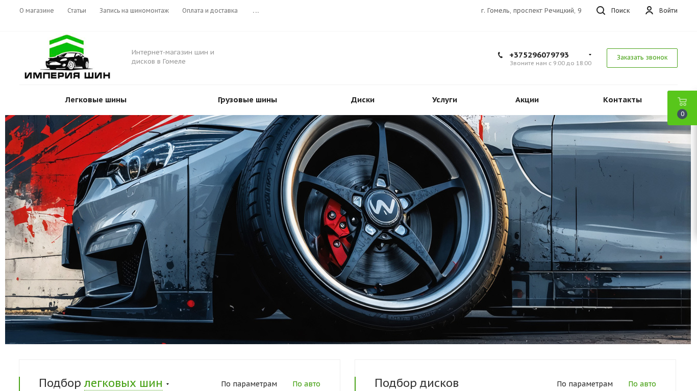 | SEO-описание | ✅ Официальный дилер шин и дисков в Гомеле! Широкий выбор летних, зимних и всесезонных шин, литых и штампованных дисков от ведущих брендов. Гарантия лучшей цены, бесплатный подбор, скидки, доставка по Беларуси. Купить шины и диски онлайн в Империя Шин – легко и выгодно! |