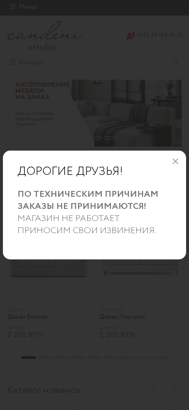 | AI-анализ | --- The website is a furniture manufacturer based in Minsk, Belarus, with a catalog offering various types of sofas and chairs on sale. Keywords related to the website include 'price', '.byn' currency, 'feet', '100', 'hit', 'new item', 'catalog', 'beds', 'divans', 'chairs', 'contacts', and '375' country code. The homepage displays several '100% HIT' products, such as a low-priced sofa on wheels for 2,205 BYN, and a u-shaped corner sofa for 3,675 BYN. New items include a white modular sofa for 3,360 BYN and a bed with a built-in drawer for 3,570 BYN. Instagram handle is @candeni_studio, and |