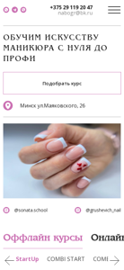 | AI-анализ | The portal KursyManikyura.by is an educational website offering both offline and online courses in nail art and pedicure. The site features courses in various techniques such as French manicure, nail design, and instructor training. It also provides information on products used in these courses, including form materials and online courses. The website offers discounts and promotions, and visitors can contact the school for more information. The offline courses are held at the address Minsk ul.Mayakovskogo, 26, while online courses are accessible from the site. The website also includes customer reviews and information on partnerships and payment methods. The site is intended for individuals who want to learn nail art techniques, increase their income, and become instructors, as well as those who want to expand their skills and communicate with different people. The course program includes instruction on correcting mistakes, increasing work speed and quality, and using social |