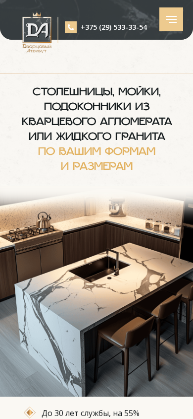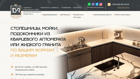 | AI-анализ | The website 'Дворцовый Атрибут' (Dvortsoviy Atribut) is a Belarusian e-commerce platform selling artificial stone products for various applications, including kitchen and bathroom countertops, sinks, and skirting boards. Visitors can use an interactive calculator to determine the cost of their chosen product based on five simple questions: what they intend to use it for, the material they prefer, and their desired installation timeframe. The website offers two materials: cast (liquid) stone and quartz agglomerate. When visitors click on the 'Получить расчет стоимости' (Get price) button, they agree to the processing of their personal data. The website also contains sections for a catalog with color and texture options and a FAQ page. The top words on the website include Russian words for 'palace attribute' (дворцовый |