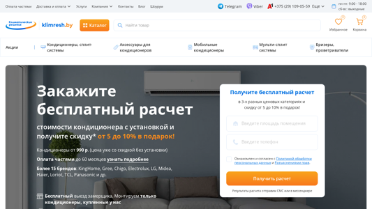 | AI-анализ | --- This website is an online store for air conditioners for home, apartment, and office use, available for purchase in Minsk and Belarus through the company "Климатические решения". The store offers various conditioners at affordable prices with delivery throughout Belarus. The website provides information on payment options, delivery and pick-up, services, company details, customer reviews, and contact information. Products include conditioners, split systems, accessories for conditioners and ventilation, thermal pumps, heating equipment, moisture control, wall mounted conditioners, and various accessories such as controllers, reflective screens, brackets, and sprays. The website offers a catalog, the ability to place an order, and a blog. The conditioners are available in various power levels, noise levels, and price ranges, including inverter and non-inverter models, energy-efficient classes "A++/A+", and |