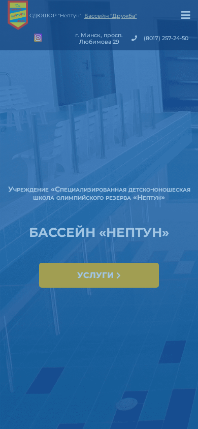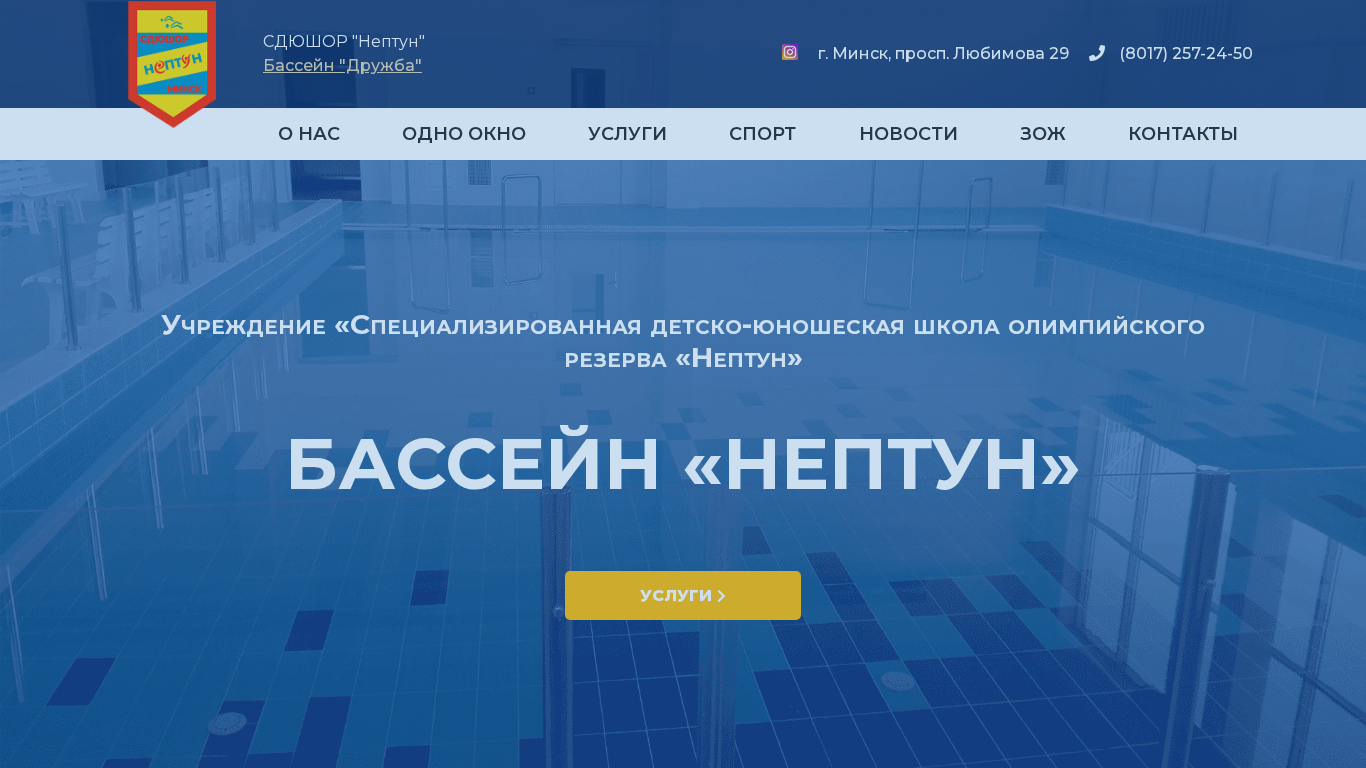 | SEO-описание | Бассейн "Нептун" в Минске - официальный сайт. Является подразделением детско-юношеской спортивной школы "Нептун". Обучение детей и подростков плаванию в микрорайоне Малиновка и Юго-Запад. |