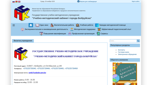 | AI-анализ | The web project "УМК г.Бобруйска" (umk.bobruisk.edu.by) is a Belarusian educational website focused on providing resources for educational institutions in Bobruysk city. The title suggests it's the "City Education Methodological Cabinet" (УМК). The description includes common keywords such as "образование" (education), "учебно-методический" (methodological), "кабинет" (cabinet), and "состав" (composition). The top words indicate that the site features news ("новости"), information about the city ("города: бобруйска"), and likely offers various educational qualifications ("квалификации"). The website's color scheme is not specified, and images are turned off. The supported languages include Belarusian and several others. |