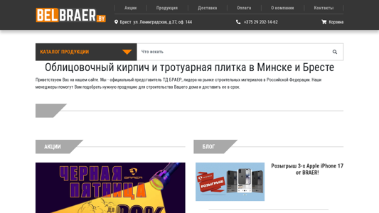 | AI-анализ | language: ru This website is an e-commerce platform for purchasing oblizochnoy kirpich (obligatory brick) and trotuarная plytka (trotuar paving stone) in Minsk and Brest, Belarus, with delivery throughout the country. The website is the official representative of TD BRAER, a leading company in the Russian market for building materials. Customers can choose their desired products and arrange delivery with the help of the website's managers. The website features promotions such as "Black Friday" and a blog. The company's address in Brest is given as ul. Leninградskaya, d. 37, of. 144, with a phone number of +375 29 202-14-62. The company's hours of operation are Monday through Friday from 9:0 |