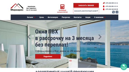 | AI-анализ | The portal Mirkaris.by is a window company website based in Minsk, Belarus. It is the largest producer of PVC and wooden windows, rollers, and doors in Minsk. The site offers various types of windows such as Salamander KBE, Rehau BrushBox, wooden windows from pine, oak, and larch, and aluminum-wood windows. The company also provides balcony frames, roll-up blinds, and sanitary windows. Services offered include free measurement, an online calculator, and installation. The site contains a catalog, prices, a photo gallery, financing options, and company information. The portal operates in Minsk from Monday to Friday, 9 a.m. to 6 p.m. Contact information is provided for three phone numbers, and there is a section for company news and FAQs. |