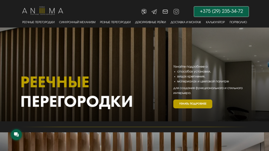 | AI-анализ | --- The web project Aniima is a Belarusian company specializing in reece and rezedny (decorative and rezine) partitions. The site offers various types of partitions, including reece partitions with a synchronous mechanism and decorative rezedny partitions. The company provides delivery and installation services, with a calculator available on the site for cost estimates. The site also features a portfolio of completed projects and customer testimonials. Aniima's production is done in-house, and the company covers over 70 cities in Belarus and Russia. With over 1000 successful projects and 99% satisfied clients, Aniima provides functional and stylish solutions for interior design. The synchronous mechanism allows for adjustable angles, zoning, and lighting. The site also offers rezedny partitions, shirmy, and panno. |