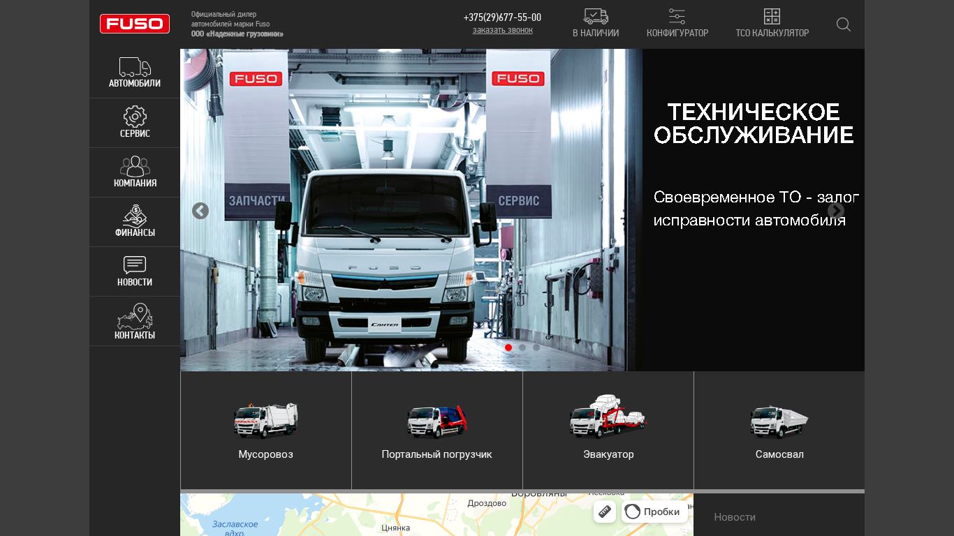 | AI-анализ | --- This website is the official dealer website for Fuso trucks in Belarus, represented by OOO "Reliable Trucks". The site offers a configurator, TSO calculator, and information about various truck models including Canter TF 7.5 and 8.55, as well as special offers. Visitors can find details on services, spare parts, financing, and leasing. News sections cover special technology on FUSO Canter TF and recent sales, such as an evakuator sold with a damaged chassis from OOO "Chayka-NN". The site also features a media bank and contact information. |