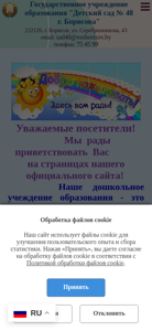 The website is the official site for State Educational Institution "Detsky Sad #48 g. Borisov" - a kindergarten located in Borisov, Belarus, at ul. Serebrennikova, 43. The site includes sections on the kindergarten's history, traditions, achievements, leadership, staff, and advisory board. It also features information on the kindergarten's educational approach, safety measures, and administrative procedures. Visitors can find details on the kindergarten's schedule, contacts, and services. Additionally, there are sections for parents, including consultation services for teachers, and information on enrollment procedures. The website also includes resources for educators, such as a virtual information and methodological cabinet, and various legal documents related to the kindergarten's operations. The site is governed by Belarusian laws and regulations on education and child welfare
