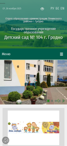 | AI-анализ | --- The website belongs to the kindergarten number 104 in Grodno, Belarus, under the administration of Leninsky District. The title is "Детский сад № 104 г. Гродно" and it provides information about the kindergarten, its leadership, educational programs, social-psychological services, and contacts. Keywords include 'education', 'Grodno', 'Belarus', 'Leninsky district', 'kindergarten', and 'number 104'. Top words are 'detsky sad' (kindergarten), 'grodno', 'number 104', 'novyi god' (new year), and 'karta' (map). The website offers information about the institution's mission, news, visit card, constitution, work schedule, leadership team, pedagogical staff, social services, achievements, |