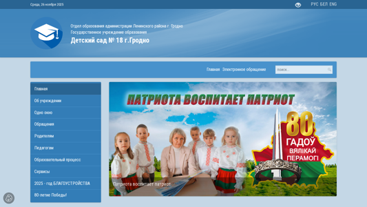 | AI-анализ | The website <ds18.lengrodno.gov.by> is titled "Детский сад № 18 г.Гродно" (Children's kindergarten No. 18 in Grodno) and is primarily about education in Grodno, Belarus. The description mentions the name and location of the kindergarten and the date "26 ноября 2025" (November 26, 2025). The top keywords include words related to education, such as "образования" (education), "дошкольного" (preschool), "учреждения" (institutions), and "детский сад" (kindergarten). Other keywords suggest the website may provide information in multiple languages, including "Беларуская" (Belarusian), "Англій |