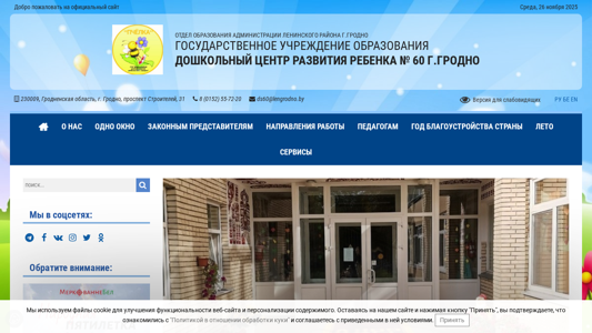 | AI-анализ | This online resource belongs to the official website of the Preschool Development Center for Children No. 60 in Grodno, Belarus. The title of the website is "Дошкольный центр развития ребенка № 60 г.Гродно" and it was last updated on November 26, 2025. The website is a part of the administrative office of the Leninsky District in Grodno City. It is a state educational institution. The address of the center is Prospekt Stryitelei, 31, 230009, Grodno, Grodненskaya oblast'. The contact number is (0152) 55-72-20 and the email address is ds60@lengrodno.by. The website also offers a version for visually impaired |