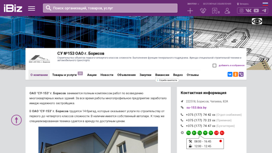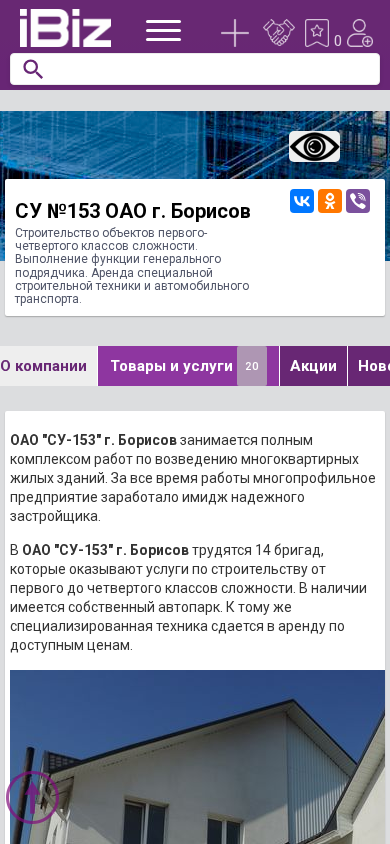| Название / Заголовок | СУ №153 ОАО г. Борисов - Строительство объектов первого-четвертого классов сложности. Выполнение функции генерального подрядчика. Аренда специальной строительной техники и автомобильного транспорта.. 222518, Борисов, , Чапаева, 82А |