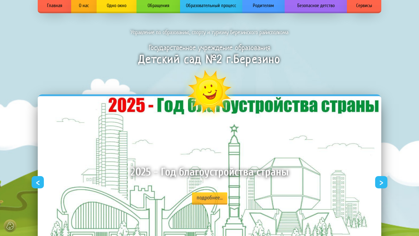 | AI-анализ | This online resource is dedicated to the Kindergarten No. 2 in the city of Berezino. The title of the website reflects its purpose, and the description provides keywords and top words related to educational institutions, Berezino, news, and contacts. The main content of the site includes information about the kindergarten's mission, leadership, team, working hours, admission process, and various policies. There are also sections for news, documents, a photo gallery, and interactive maps. The website complies with data protection regulations and offers an 'one-window' service for administrative procedures. The kindergarten's educational process is detailed, covering patriotic education, special education, information-methodical cabinet, and various educational projects. Parents are encouraged to engage with the kindergarten and there is information on enrollment, health and nutrition, and child safety. The site is governed by the Berezino District Executive |