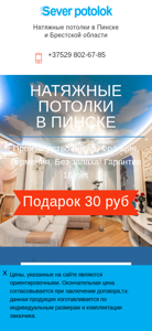 | AI-анализ | The portal "Pinsk.potolki-natjazhnye.by" is an e-commerce website offering various types of suspended ceilings in Pinsk, Belarus. The site lists different models, including matte, satin, and glossy ones, and provides information on their dimensions, prices, and availability. Prices mentioned on the site are indicative, as the final cost is determined during the contract negotiation stage. The company sells and installs suspended ceilings in Pinsk and the Brestskaya region. Contact information is provided for those interested in placing an order, including a phone number and an option to request a callback. The site features a photo gallery of completed projects, including client testimonials and contact details. Suspended ceiling models, dimensions, and prices for various rooms (kitchen, bedroom, bathroom, living room, studio, children |