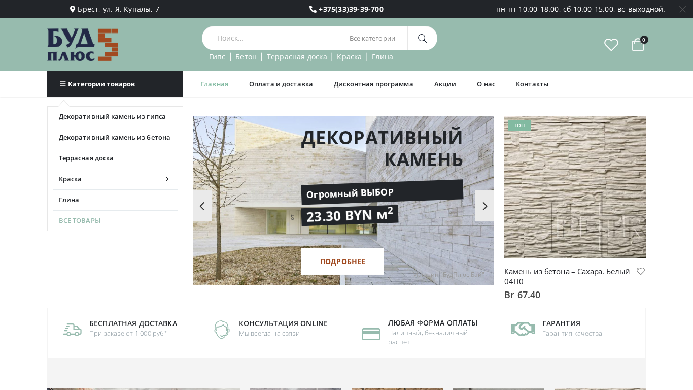 | SEO-описание | Магазин БудПлюс Бай предлагает декоративный камень из гипса и бетона, жаростойкие кладочные смеси, террасную доску и сопутствующие стройматериалы |