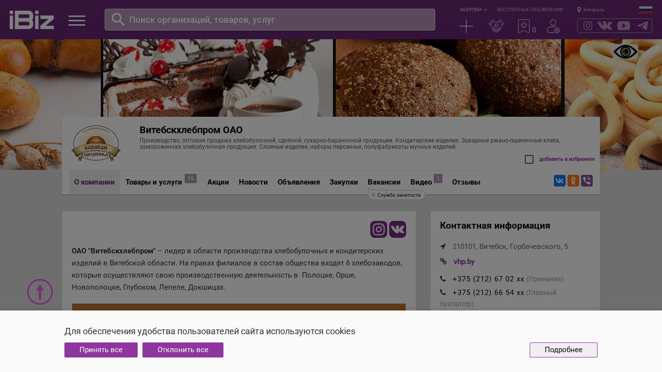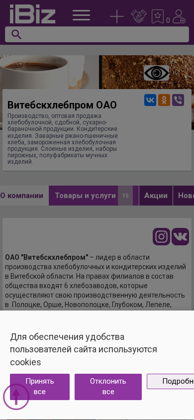 | AI-анализ | The web project "Vitebskkhlebprom OAO" is a company based in Vitsebsk, Belarus, specializing in the production and wholesale sale of various types of baked goods. Their product range includes hlebobulochnaya (bread and baked goods), sdobnaya (confectionery), suharno-baranochnaya (pastry and meat pies), and konditerskie izdelia (confectionery items). They produce заварные rzhanopshnicheskie hleba (steamed rye-wheat bread), замороженnaya hlebobulochnaya produktsiya (frozen baked goods), слоенyie izdeliia (layered products), наборы pirozhnykh (sets of pies), and polu |