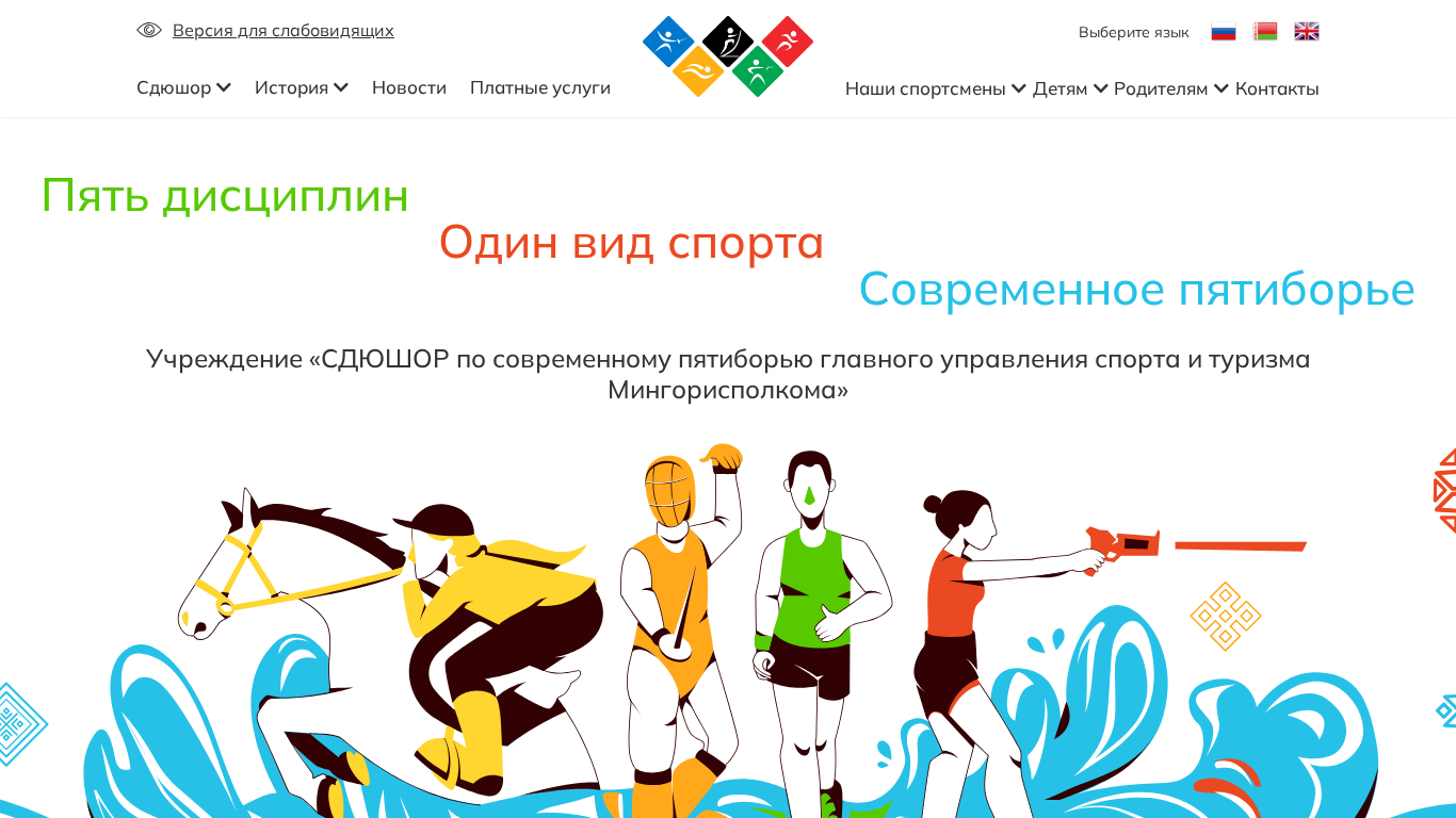 | AI-анализ | This website is for the Contemporary Pentathlon School in Minsk, Belarus. It provides information about the organization, its history, and various aspects of contemporary pentathlon and archery. The website includes sections on the administration, training and teaching staff, normative documents, ideological work, vacancies, news, and paid services. It also offers language options for Belarusian, Abkhazian, Avarian, Azerbaijani, and other languages. The title of the website is "Учреждение «СДЮШОР по современному пятиборью" (Establishment of the Contemporary Pentathlon School). |