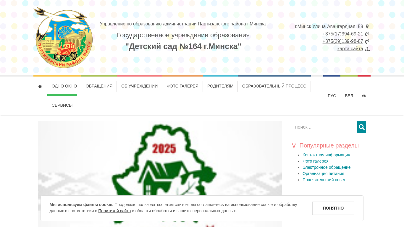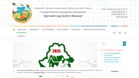 | AI-анализ | The web project "Детский сад №164 г.Минска" (Preschool #164 in Minsk City) is an educational institution's website operated by the Education Administration of the Partizan District in Minsk, Belarus. The site provides administrative procedures, contact information, and regulatory documents for the State Educational Institution "Детский сад №164 г.Минска" (Preschool #164 in Minsk City) located at Ulitsa Avanhardnaya, 59, in Minsk. The site includes sections for administrative procedures, telephone numbers, normative legal acts, and contact information for higher authorities. The site also features a schedule for citizen reception, working hours for the administration, and a list of government organizations responsible for processing appeals in various areas of population life. Additionally, the site includes |
