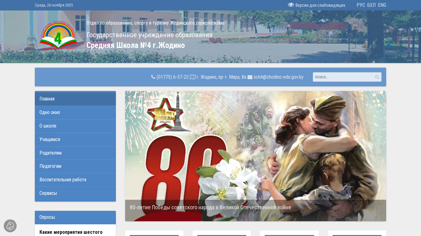 | Адрес | горисполкома, Государственное учреждение образования, Средняя Школа №4 г. Жодино, (01775) 6-57-22, г. Жодино, пр-т. Мира, 8а |