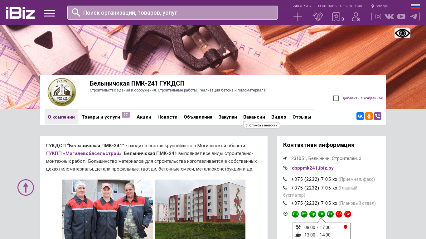 | Название / Заголовок | Белыничская ПМК-241 ГУКДСП - Строительство зданий и сооружения. Строительные работы. Реализация бетона и пиломатериала.. 231051, Белыничи, , Строителей, 3 |