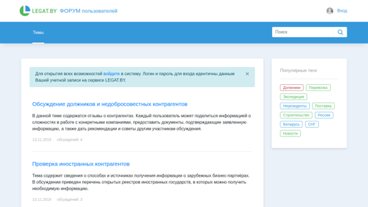 | AI-анализ | This online resource is a user forum for Legat.by, a Belarusian business services platform. Users can discuss various aspects of working with specific contractors in this forum. The forum contains several topics, including reviews of contractors, methods for checking foreign contractors, news about Legat.by, and discussions on debt collection and reliable contractors. Each user can share information, documents, and recommendations related to their experiences with particular companies. The forum also provides information on sources for obtaining information about foreign business partners and includes a section on popular tags related to Legat.by and various industries. Users need to log in to access all features of the forum, using the same login and password as their Legat.by account. |