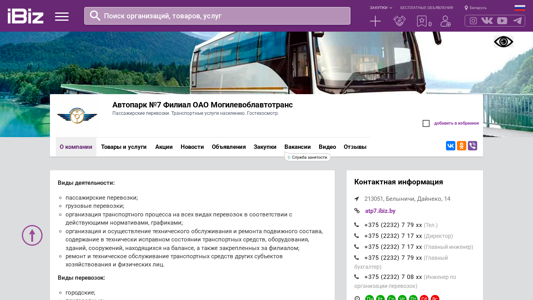 | AI-анализ | The web project "Autopark №7 Filial OAO Moгилевоблавтотранс - Passazhirskie Perevozki. Transportnye Uslugi Naseleniyu. Gostehsmotr." is a transport services company located at 213051, Belynichi, Daineko, 14, offering passenger transportation services to the public. The website provides a schematic diagram of the route, contact phone numbers, and the address of the company. The company's activities include passenger transportation services, cargo transportation services, and the organization of the transportation process for all types of transportation in accordance with current regulations and schedules. Additionally, the company offers technical maintenance and repair services for transport vehicles and equipment, as well as buildings and structures on its balance sheet. The company provides city, suburban, intercity, and international transportation services. The website |